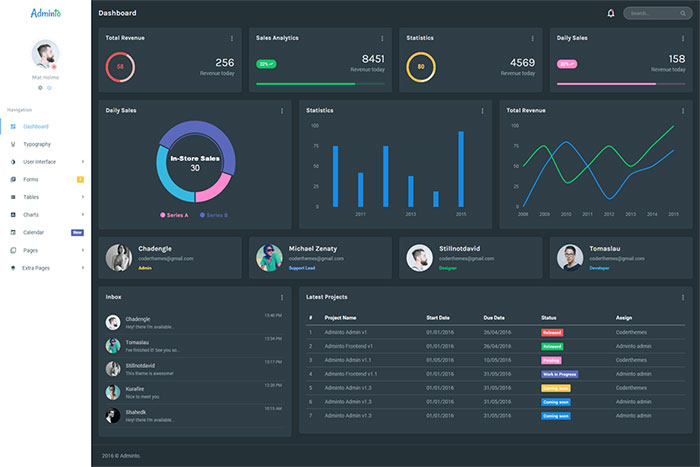 Data analitical dashboard adaptable to all devices, with ui components and animated interactions.